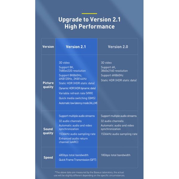 Product features: 8K@60Hz, 4K@120Hz, 2K@144Hz; Transmission bandwidth 48Gbps; 3D function; Dynamic HDR; Enhanced audio return channel eARC; Variable refresh rate VRR; Fast media switching QMs; Fast frame transmission QFT; Audio